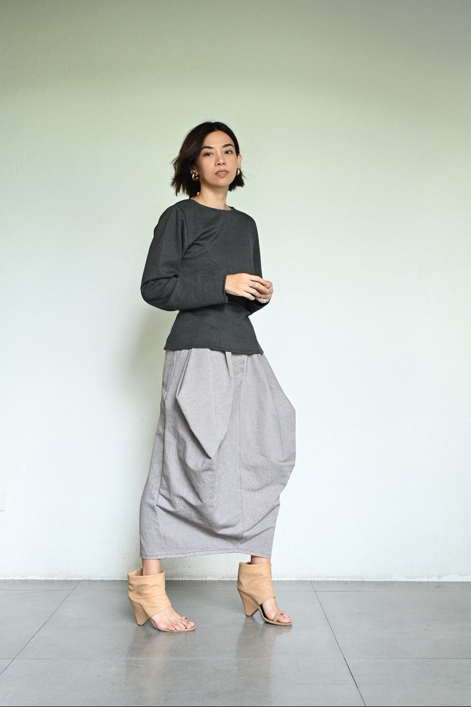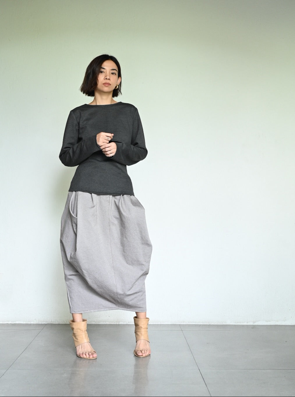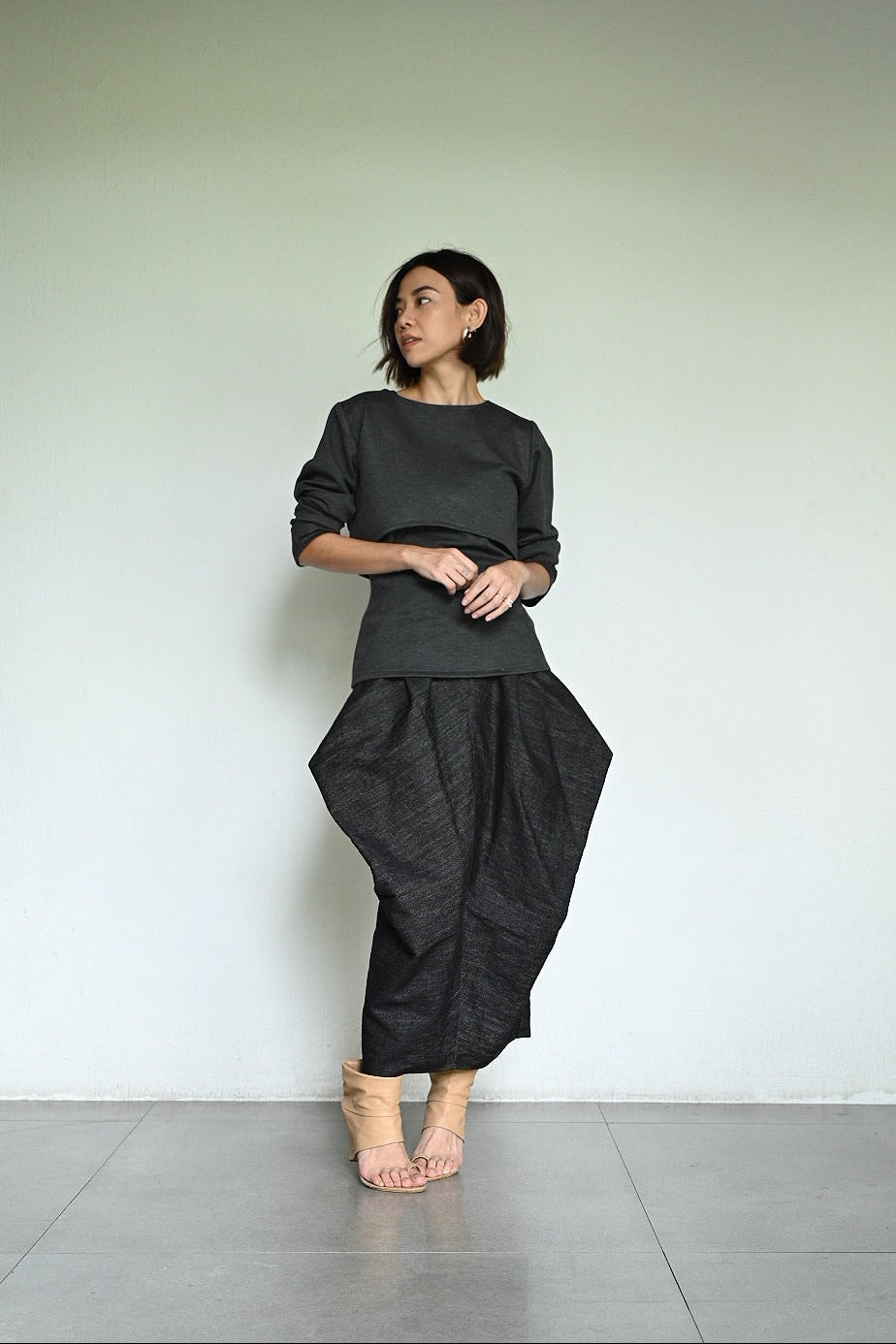11:11 Degas Pullover paired with the Kakoi Skirt, artful structure meets fluid lines