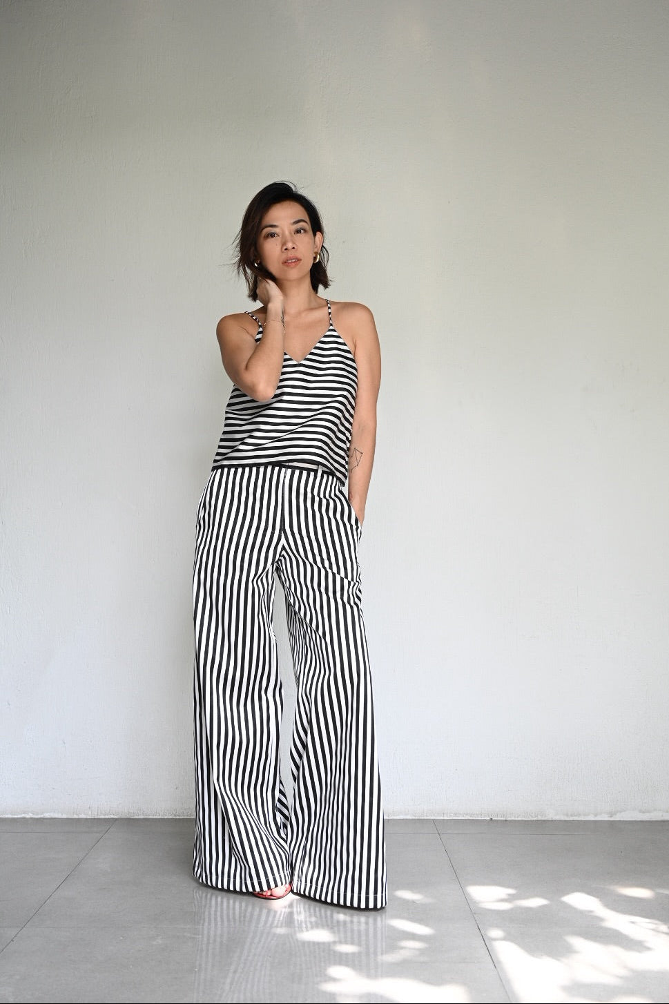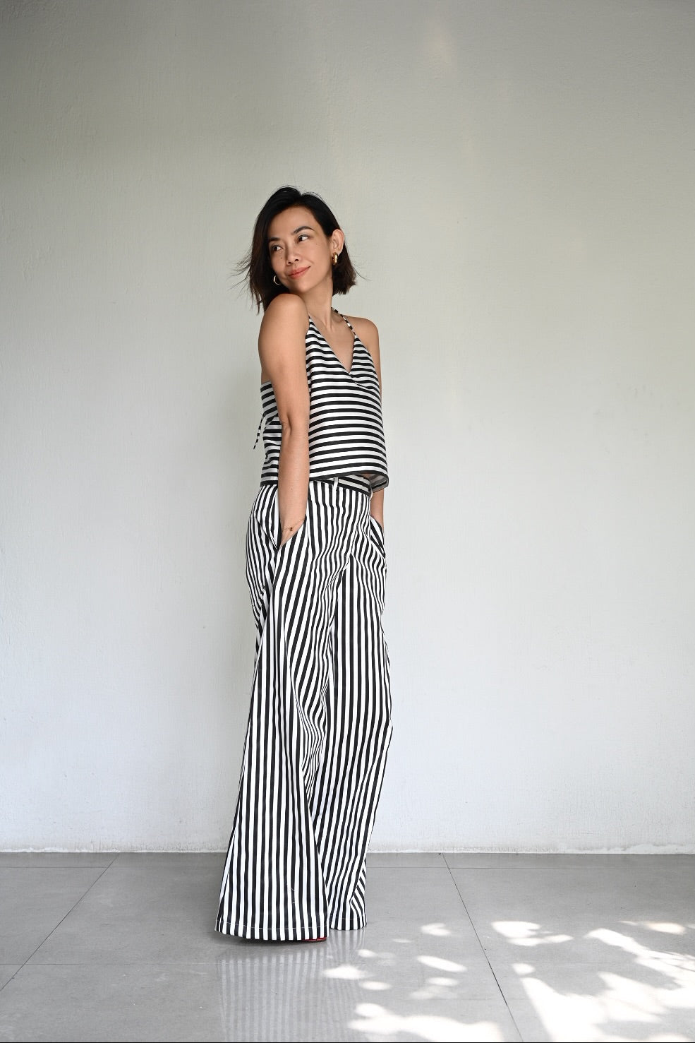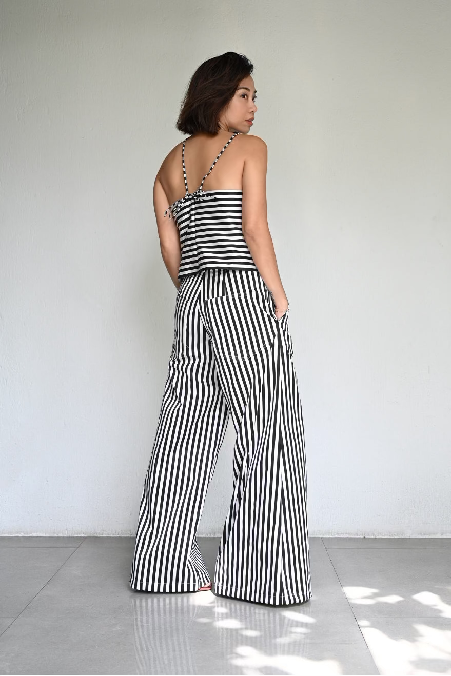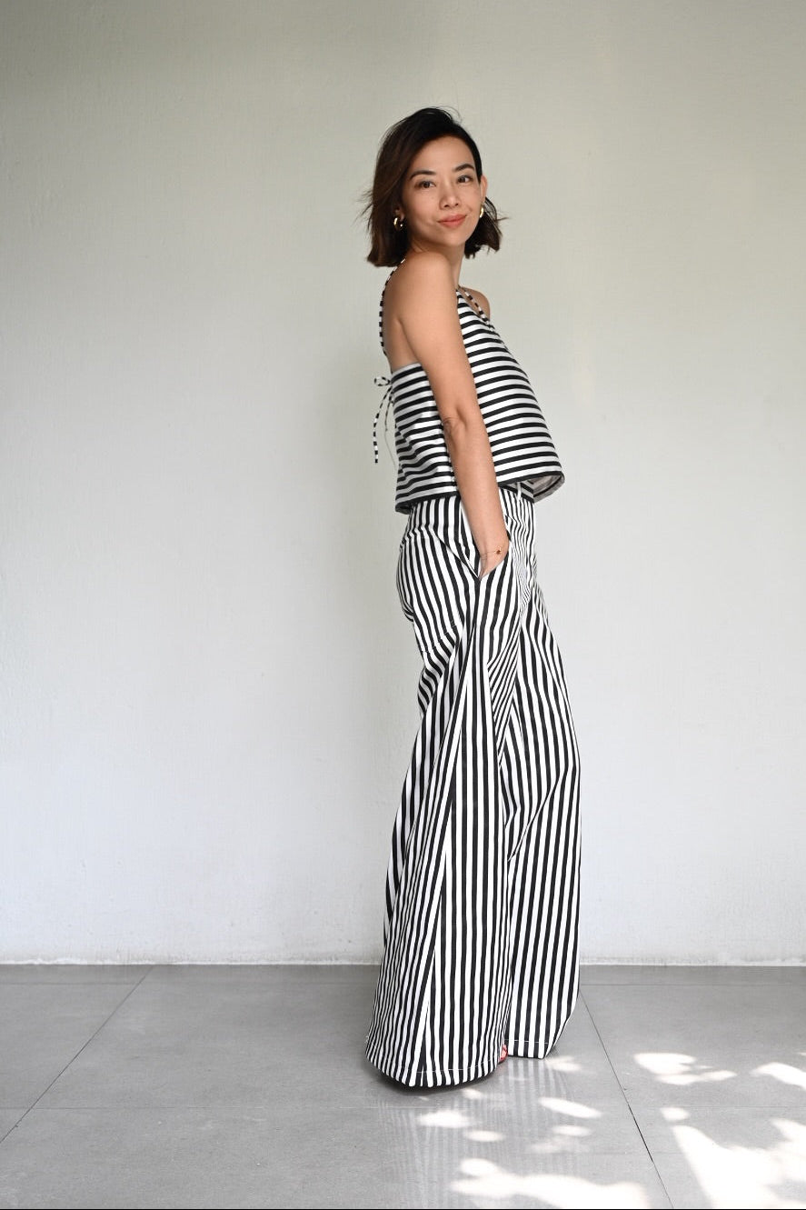 A play on bold stripes in clean, effortless lines. The Aina is a halter with light structure, paired with the wide-leg Bonne Pants that elongate and move with ease. Made from striped satin, a matching set that feels cool, crisp, and quietly striking.