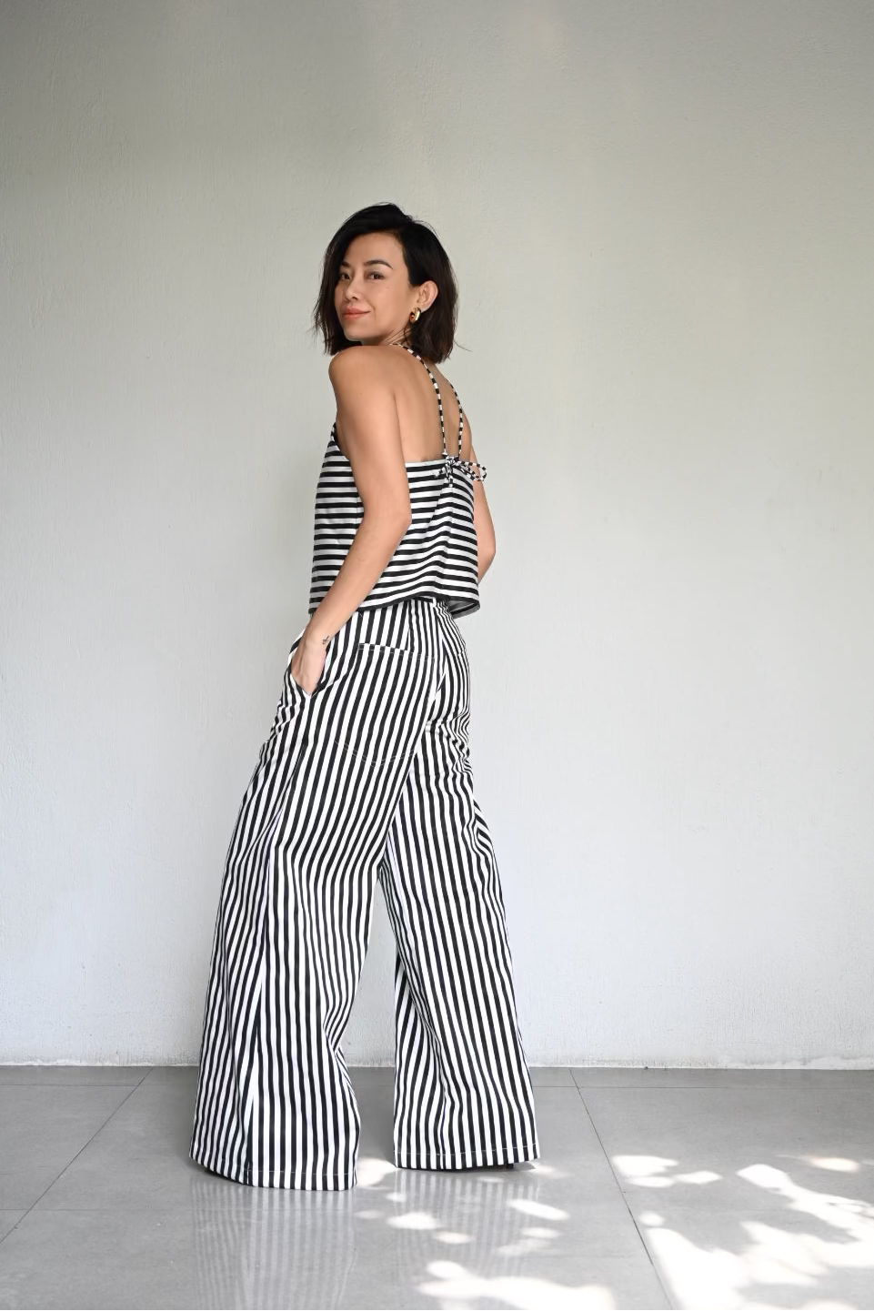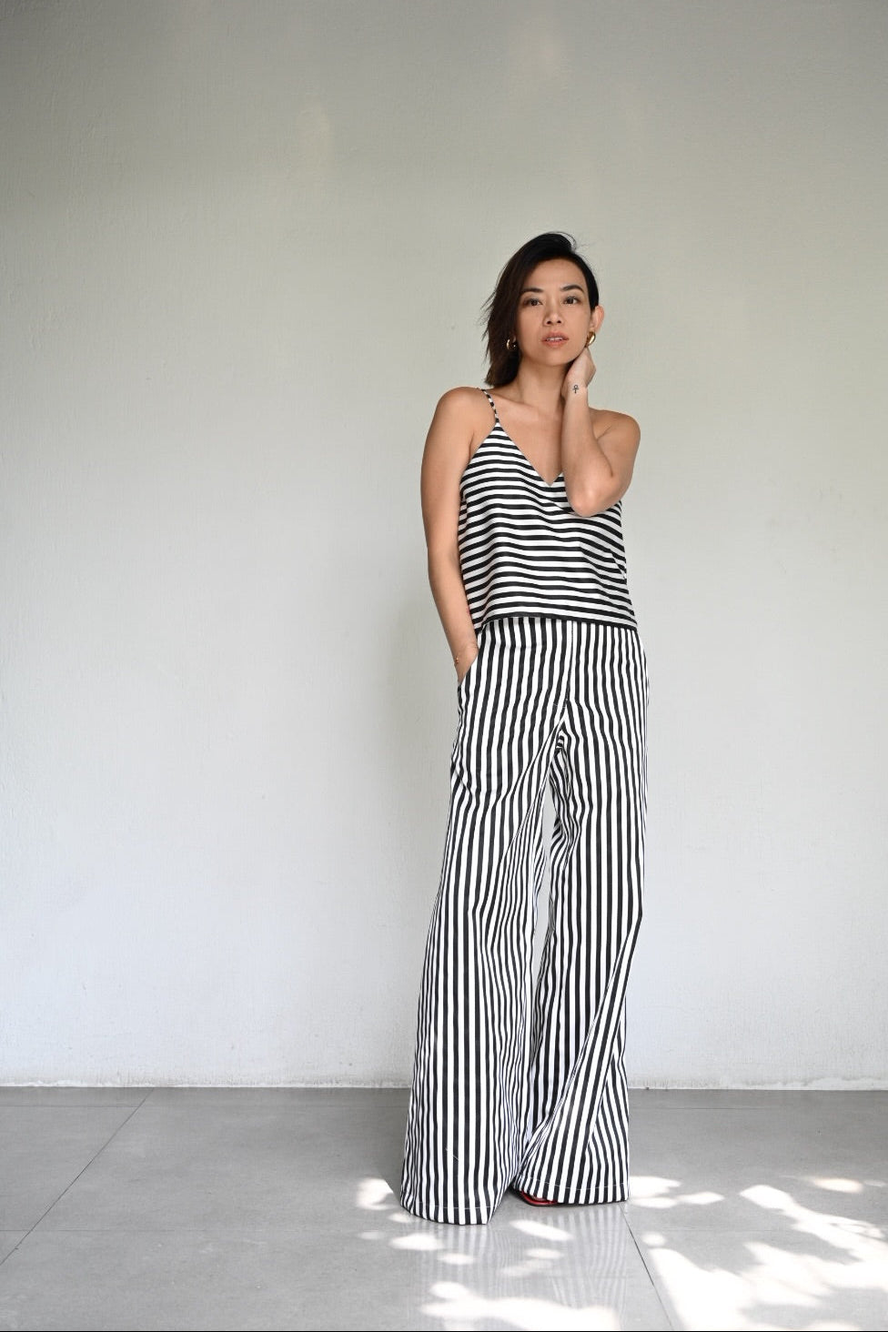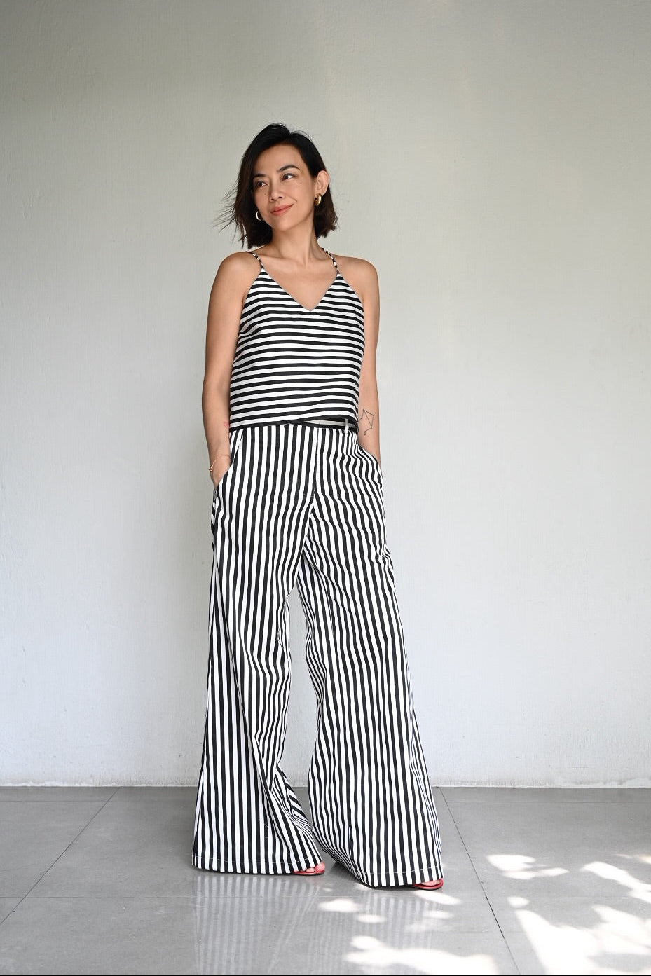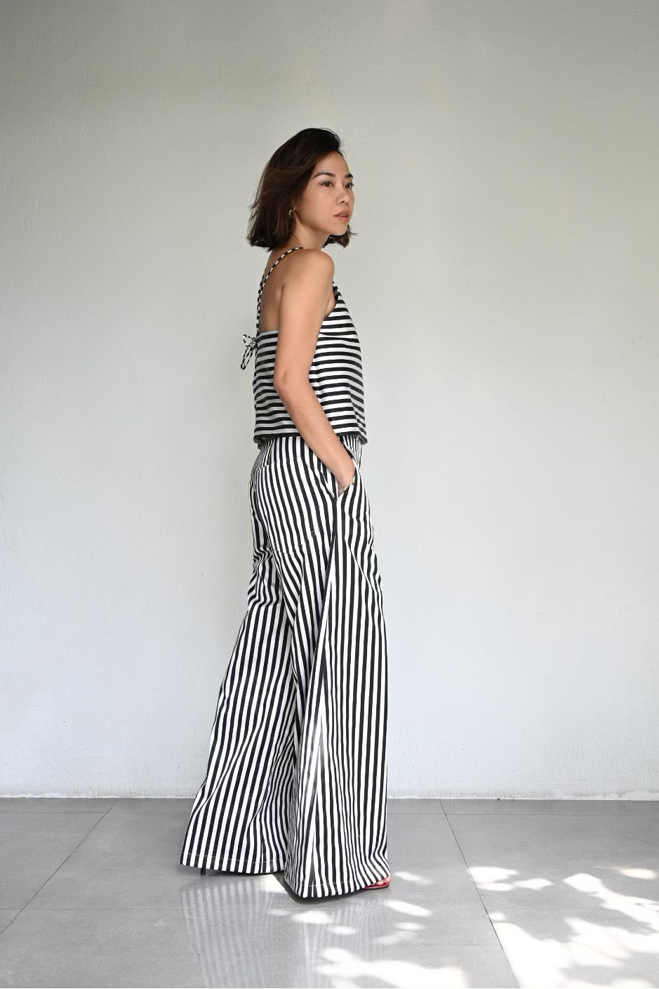 A play on bold stripes in clean, effortless lines. The Aina is a halter with light structure, paired with the wide-leg Bonne Pants that elongate and move with ease. Made from striped satin, a matching set that feels cool, crisp, and quietly striking.