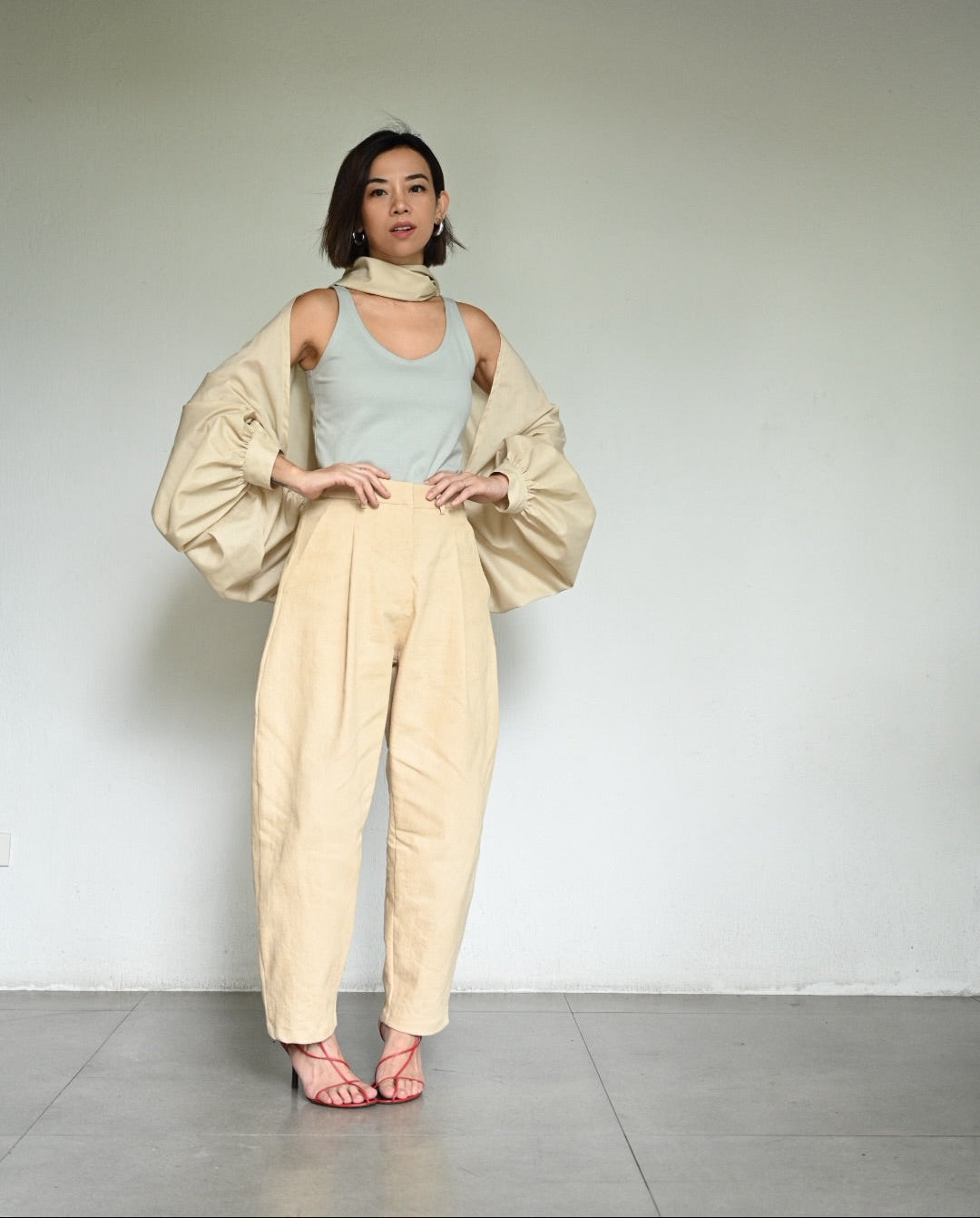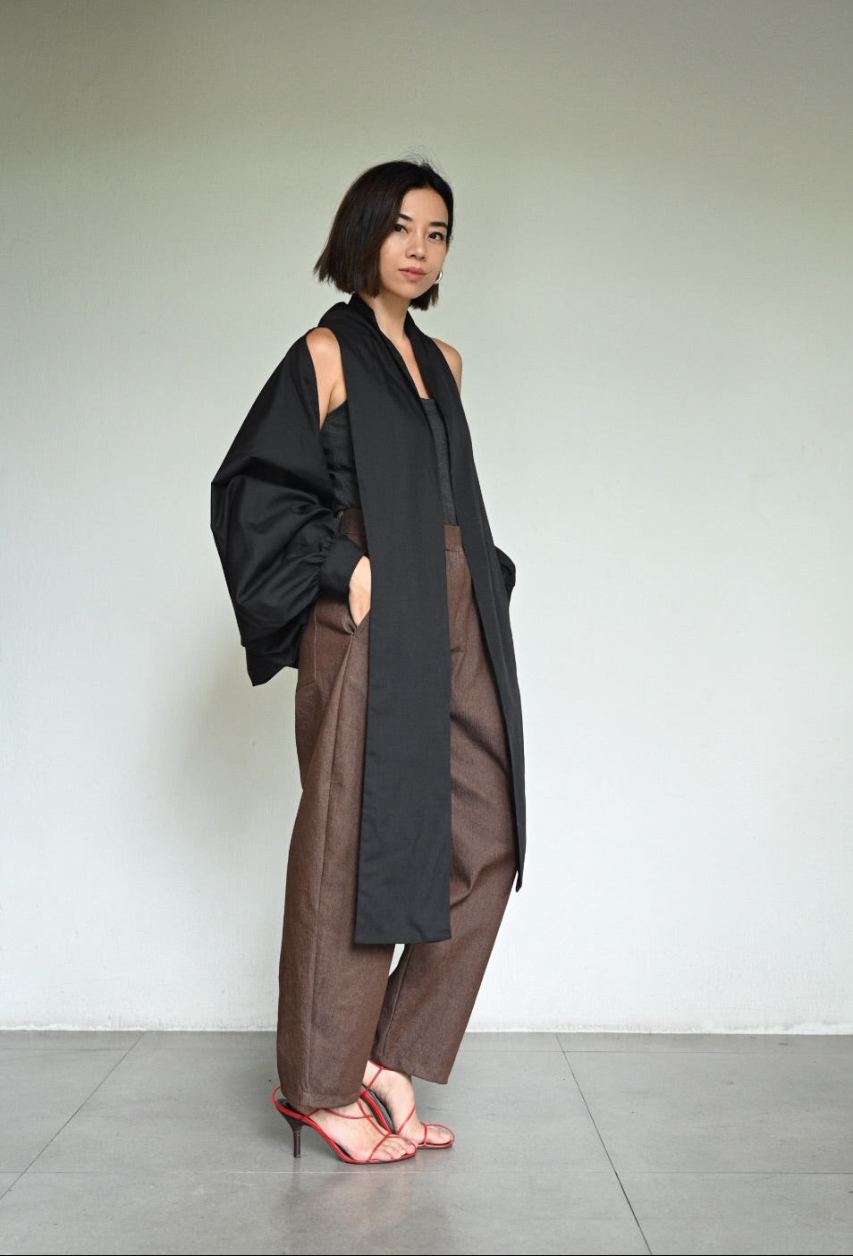 Meet the Ophelia Topper, an architectural layer defined by sculptural sleeves and a dramatic silhouette. Effortlessly shifting between cover-up and statement piece, it lends instant edge to any look. Paired with the Josi Barrel Jeans, a relaxed barrel-cut with a clean front pleat, tailored yet comfortable, it becomes the perfect balance of structure and ease. Together, they embody quiet strength and versatility: structured yet fluid, bold yet wearable.