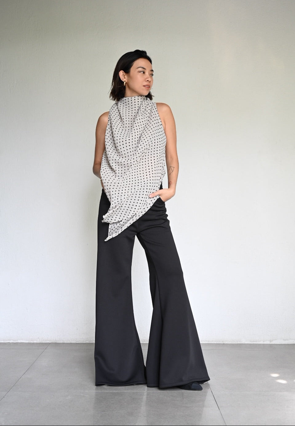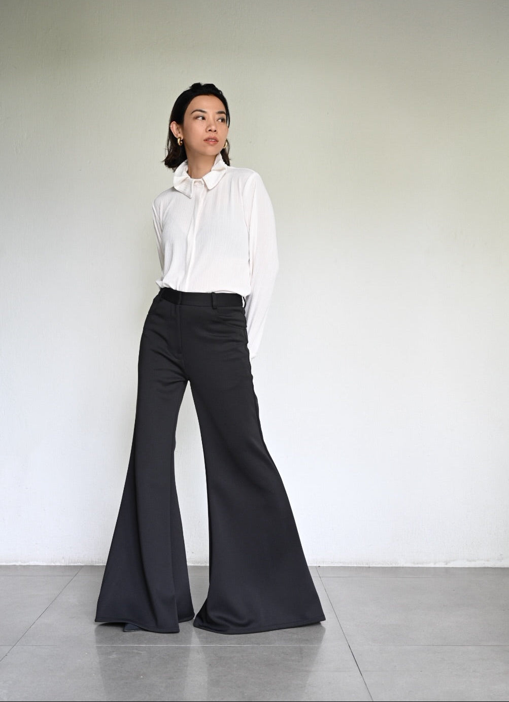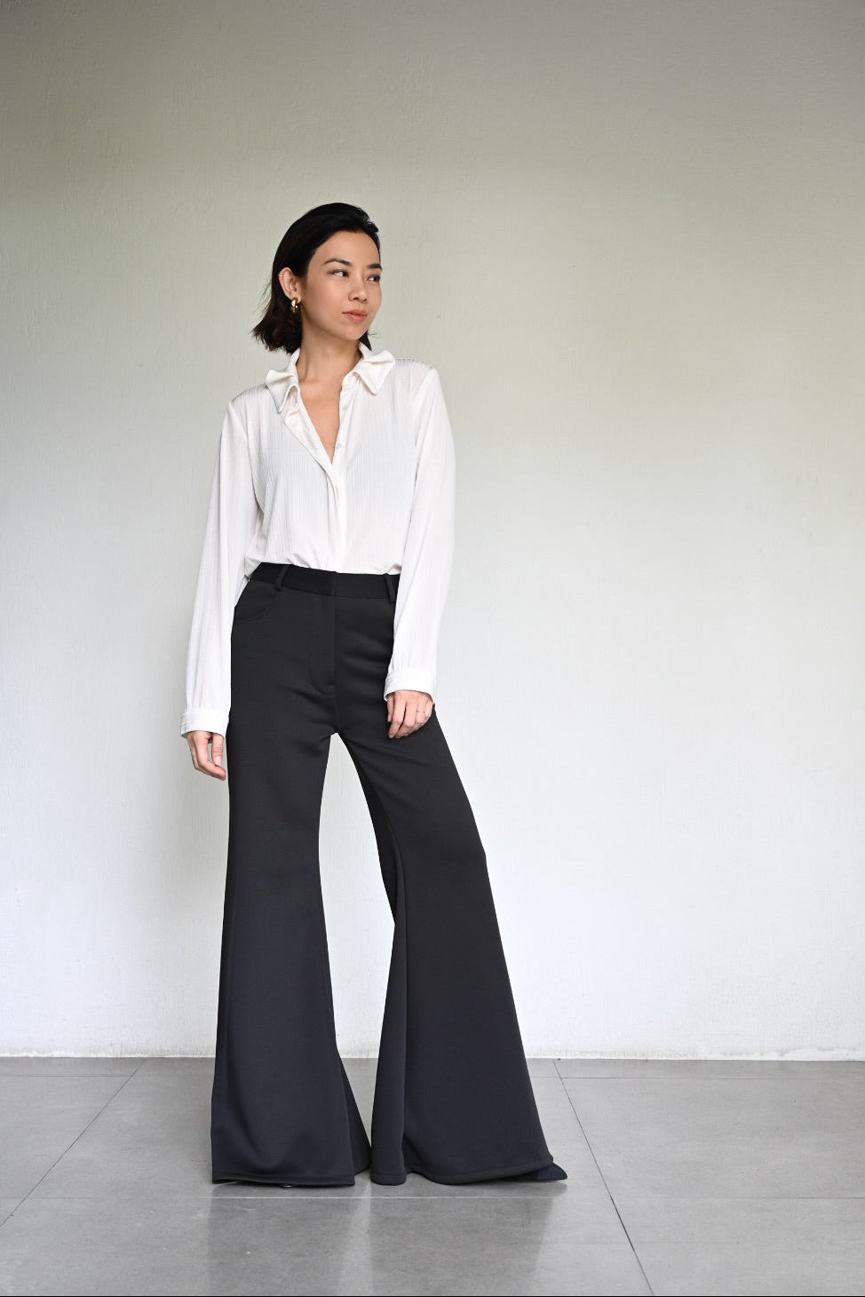 A bold, sculpted silhouette made from black neoprene fabric. The Malta Pants feature a dramatic flared leg that creates length, movement, and a festive drama, grounding any top with structure and modern ease.