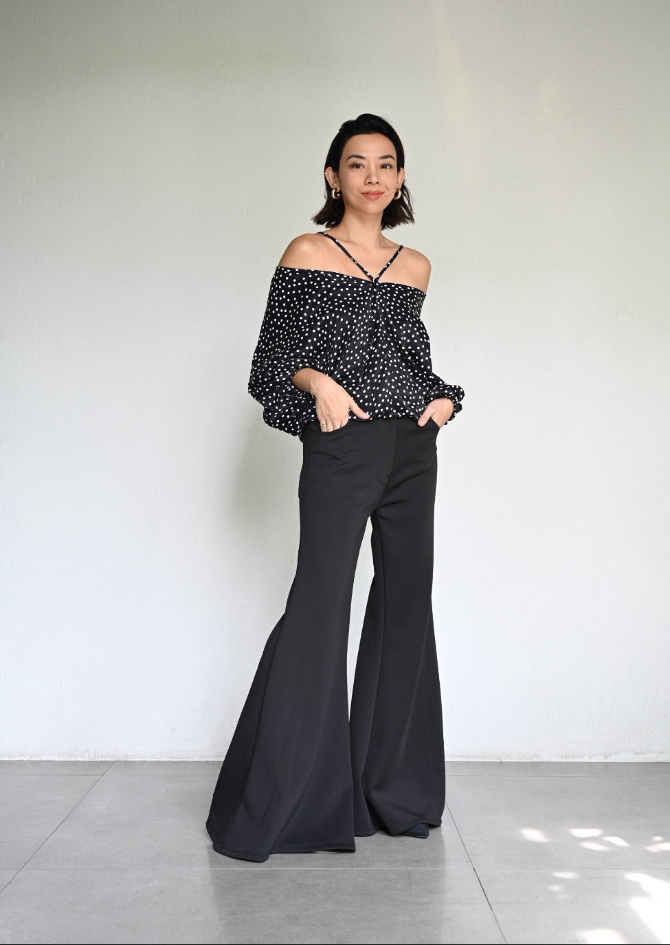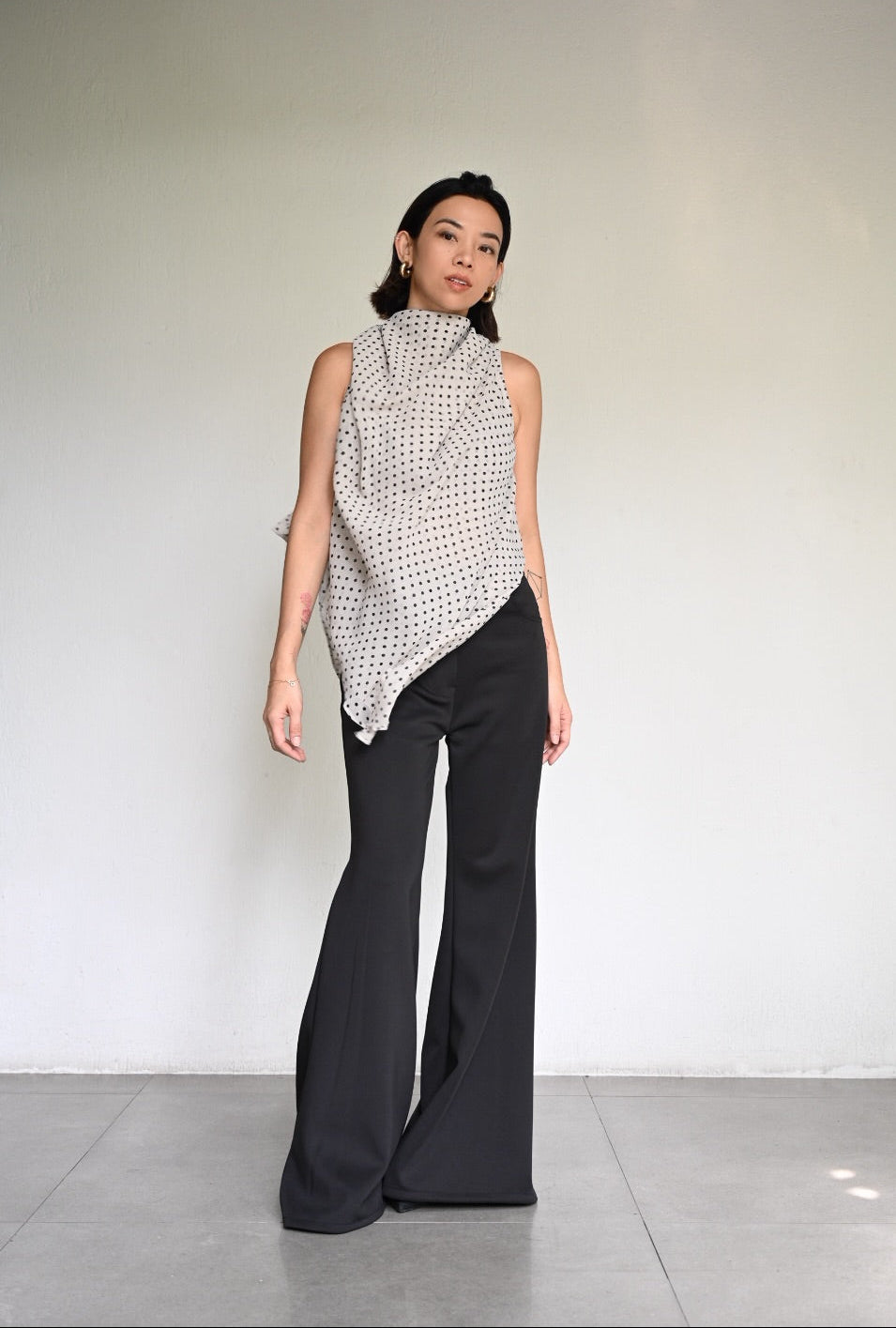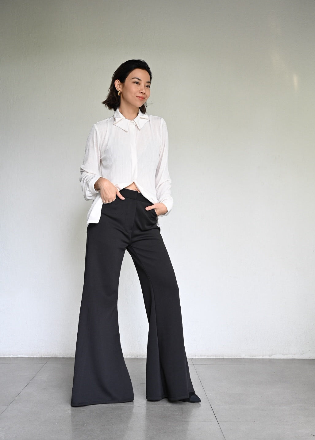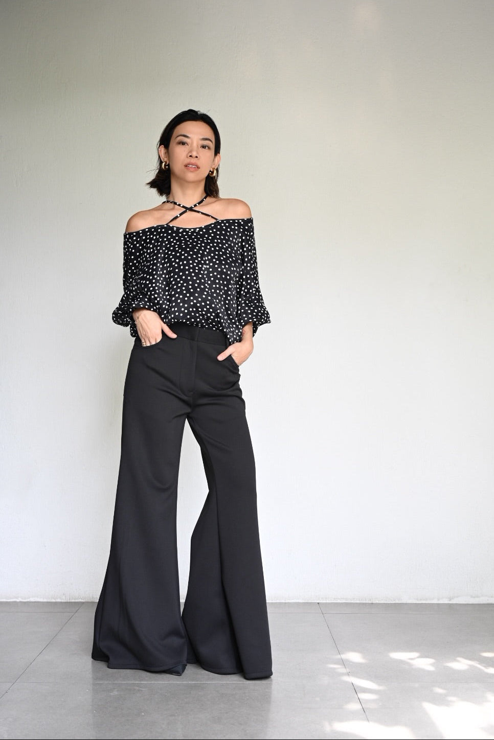 A bold, sculpted silhouette made from black neoprene fabric. The Malta Pants feature a dramatic flared leg that creates length, movement, and a festive drama, grounding any top with structure and modern ease.