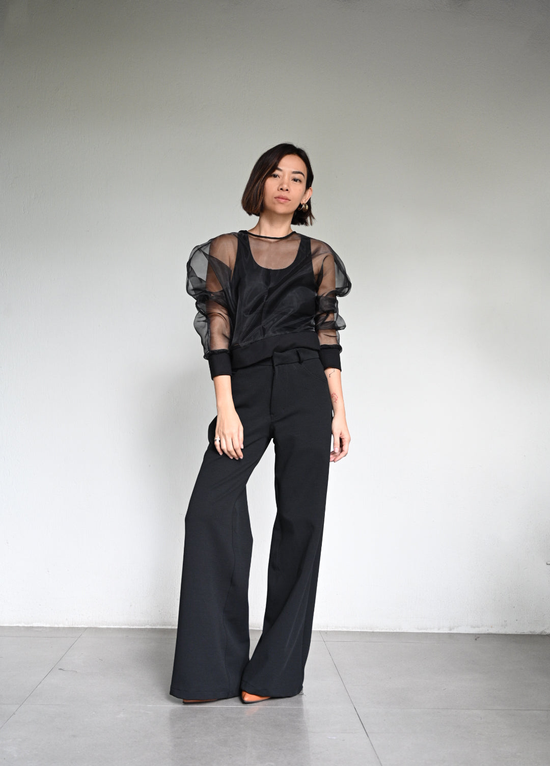 The SADIE Pullover is made of lightweight organza with a full silhouette, giving it a modern and structured look. Pair it with the Maseo Trousers, crafted from heavy wool with a slight flare that balances the fullness of the top.