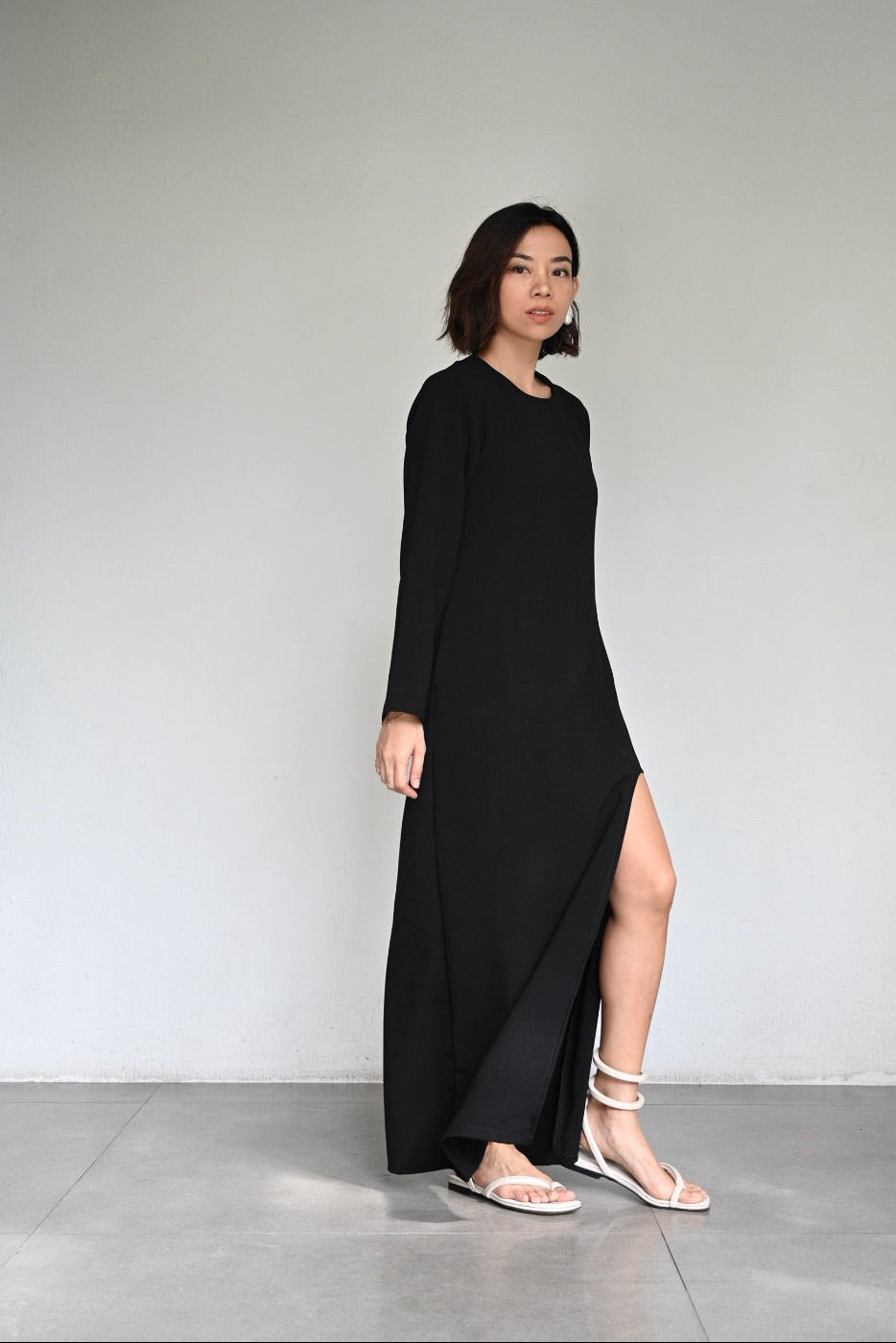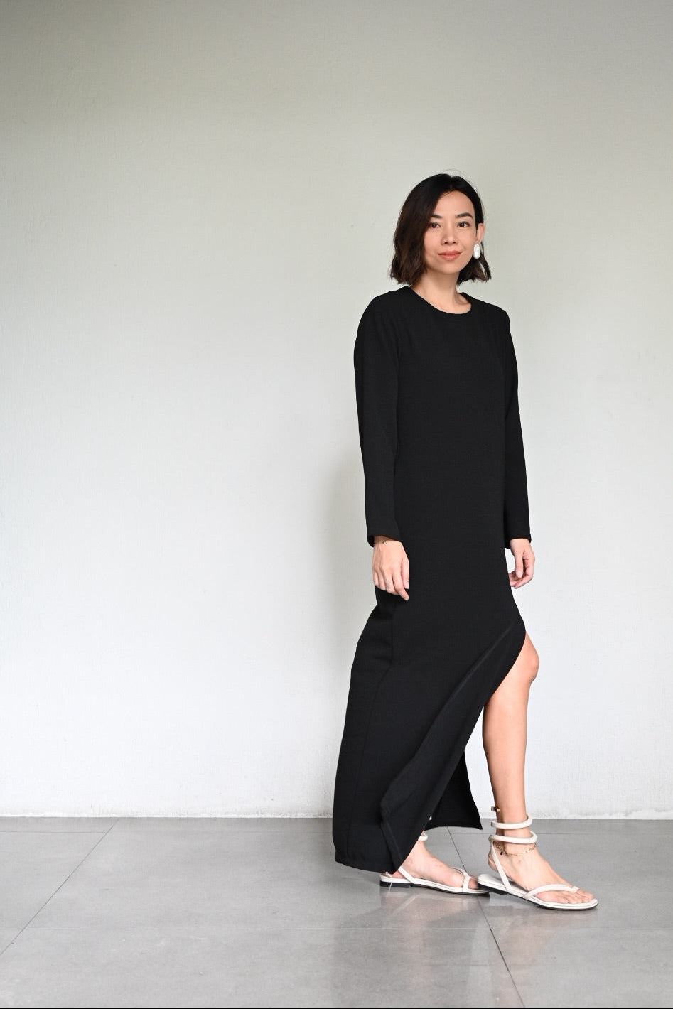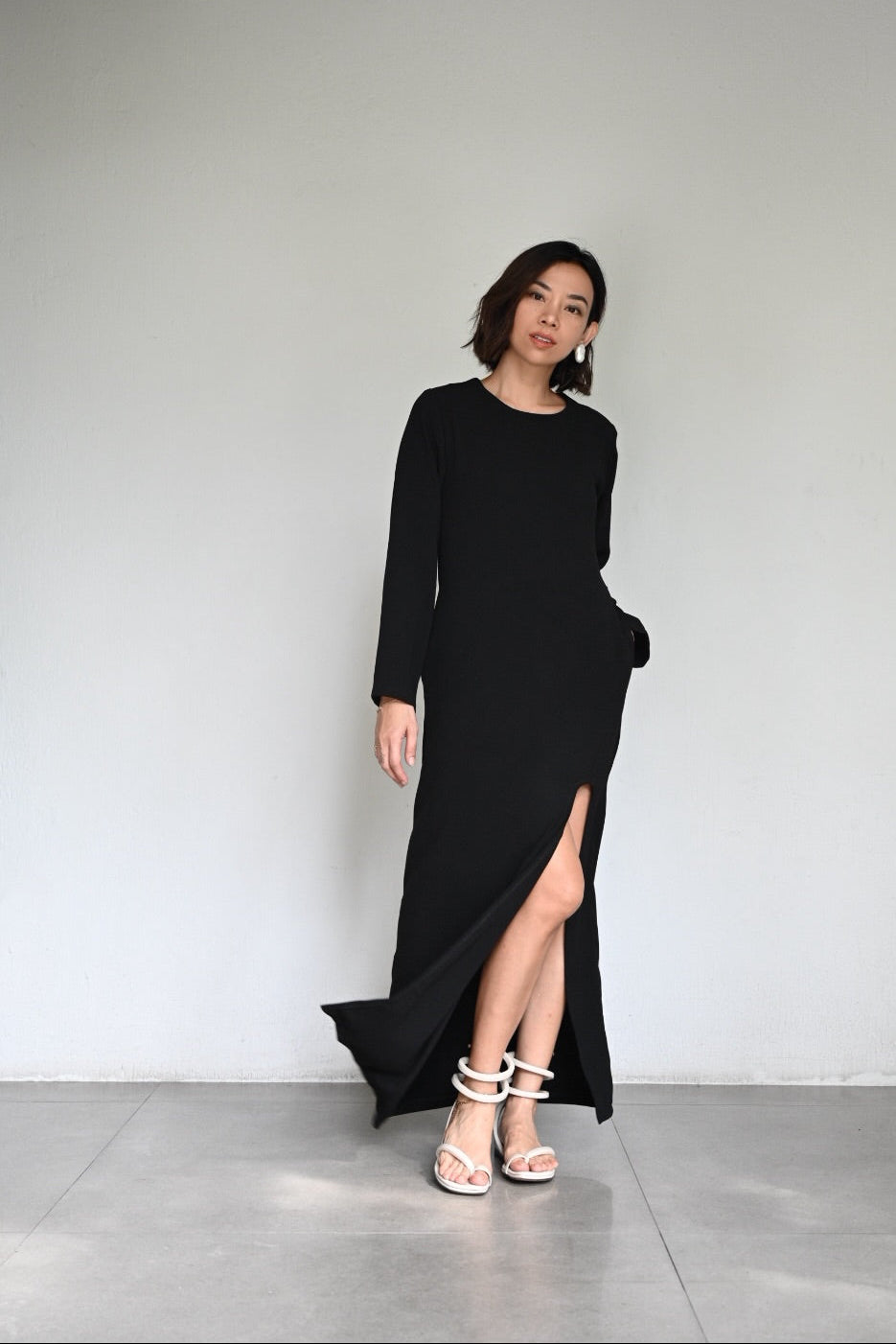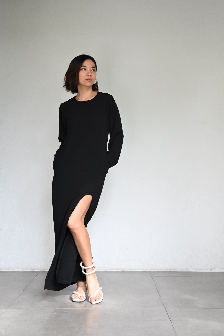 A long-sleeve column dress with an easy, sculpted silhouette and a bold side slit that brings just the right amount of movement. Sleek, comfortable, and quietly striking, the Nola slips on effortlessly and holds its shape with understated elegance.