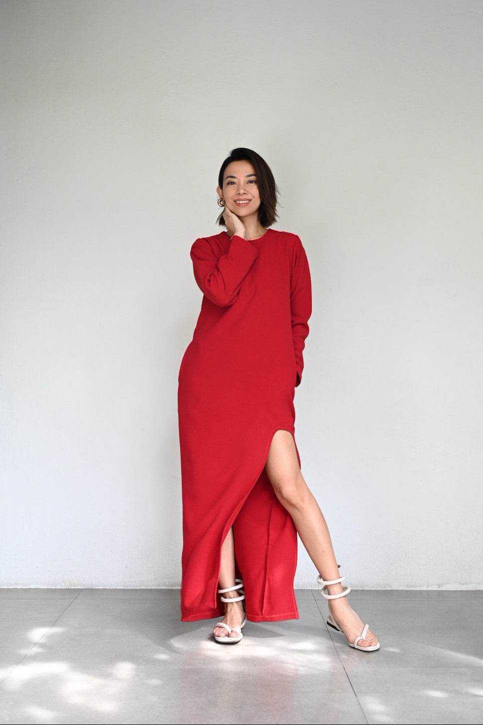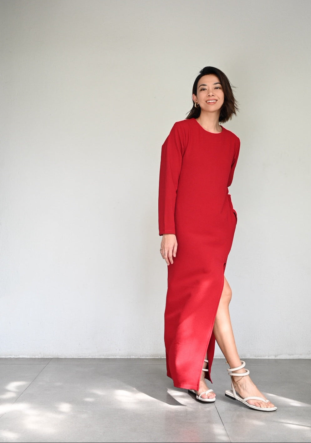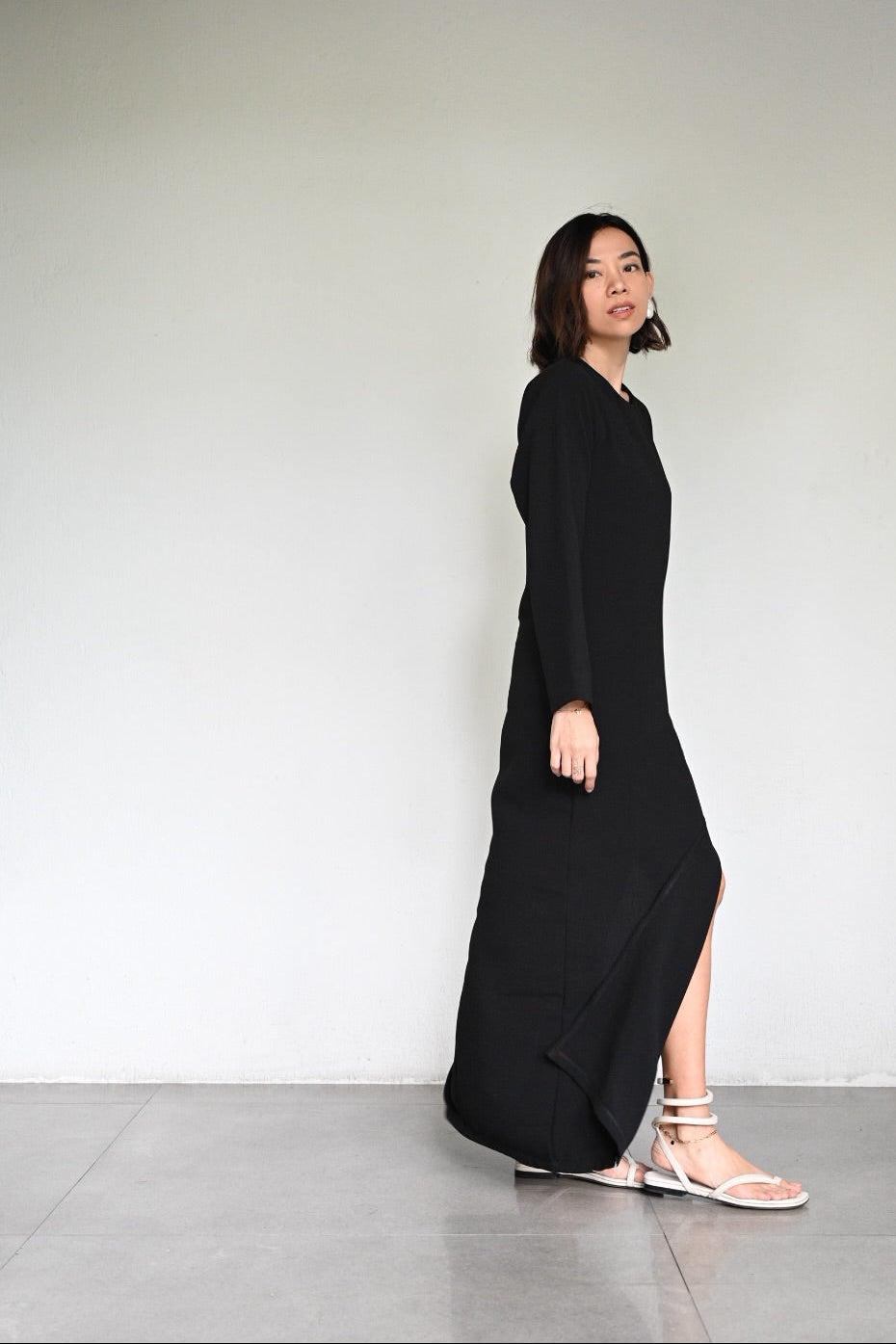 A long-sleeve column dress with an easy, sculpted silhouette and a bold side slit that brings just the right amount of movement. Sleek, comfortable, and quietly striking, the Nola slips on effortlessly and holds its shape with understated elegance.
