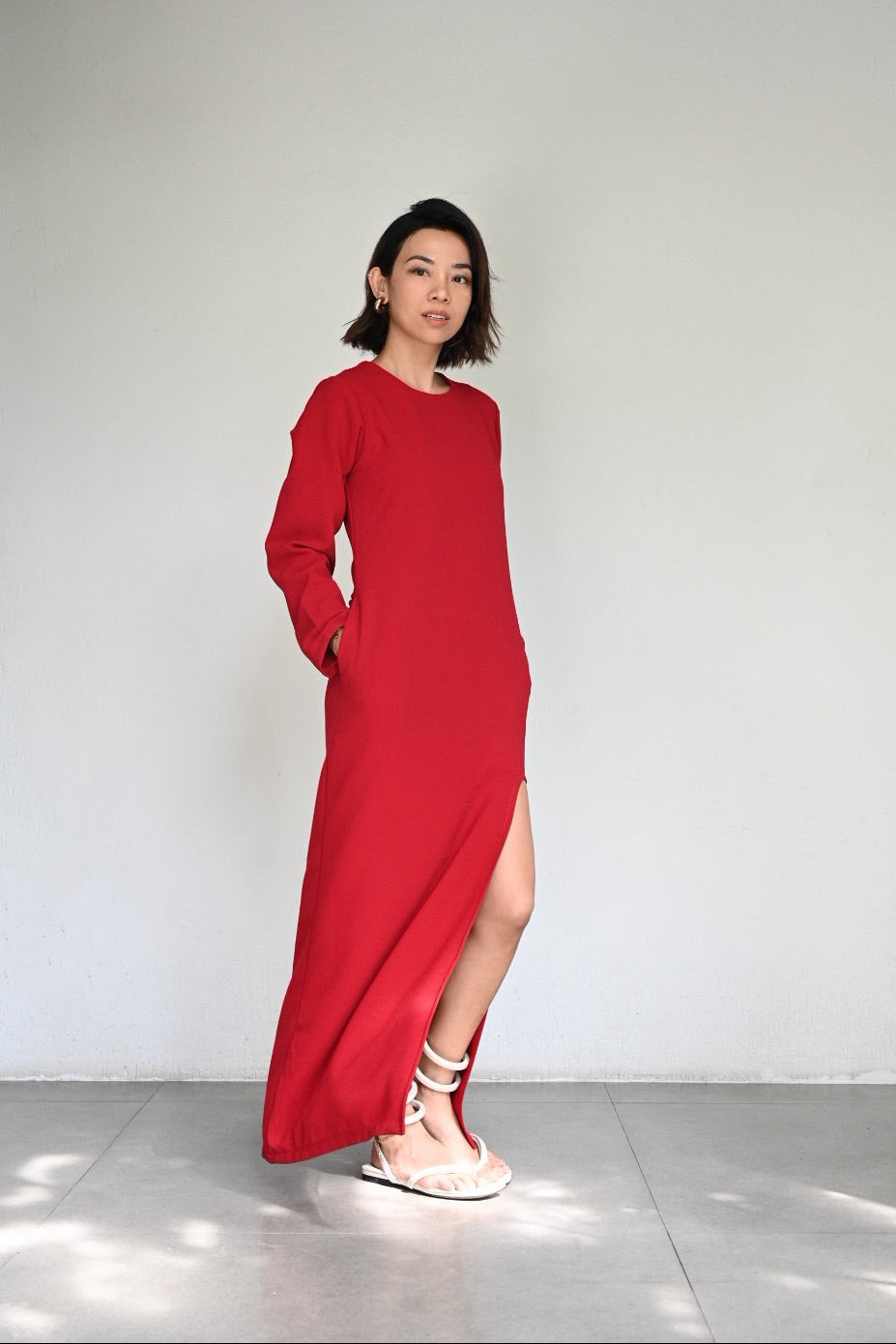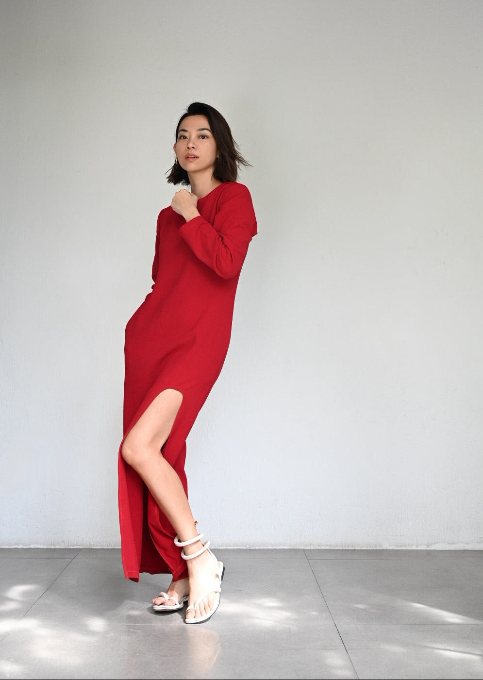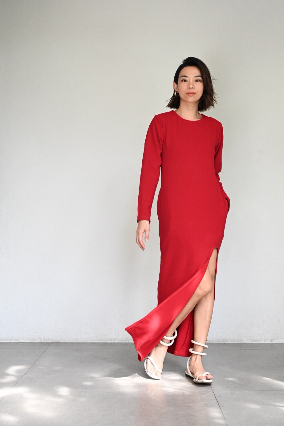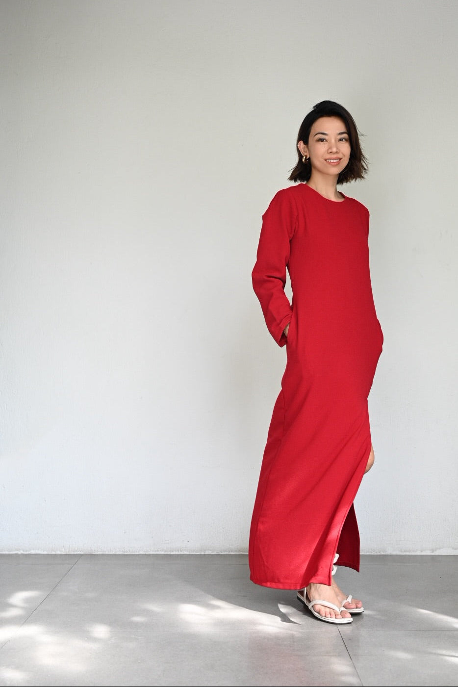 A long-sleeve column dress with an easy, sculpted silhouette and a bold side slit that brings just the right amount of movement. Sleek, comfortable, and quietly striking, the Nola slips on effortlessly and holds its shape with understated elegance.